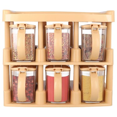 This set of spice rack and spice jars is made from absolute premium quality plastic material this master chef three-tier spice rack looks great in any kitchen and is useful to any cook who wants to keep spices handy. Comes with 6 beautifully designed spice jars with large curvy handles. Each jar has a spoon within it! three tiers make room for an extra shelf at the top to add additional space in your kitchen!