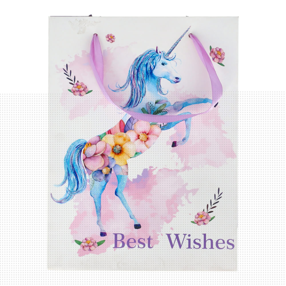 Beautiful gift bag with funky colorful unicorn design pattern. Made of thick smooth paper. The gift bag comes with black string handles. With eye-catching patterns and colors, this bag will compliment your gift very well.
