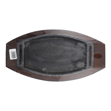 Sizzling dish oval tray solid cast iron construction and wooden holder. With lifting handle for your choice. Very rustic and authentic look on your table. Great for hispanic and japanese cooking. Great cast iron hot plate and handle with wooden holder for the table.